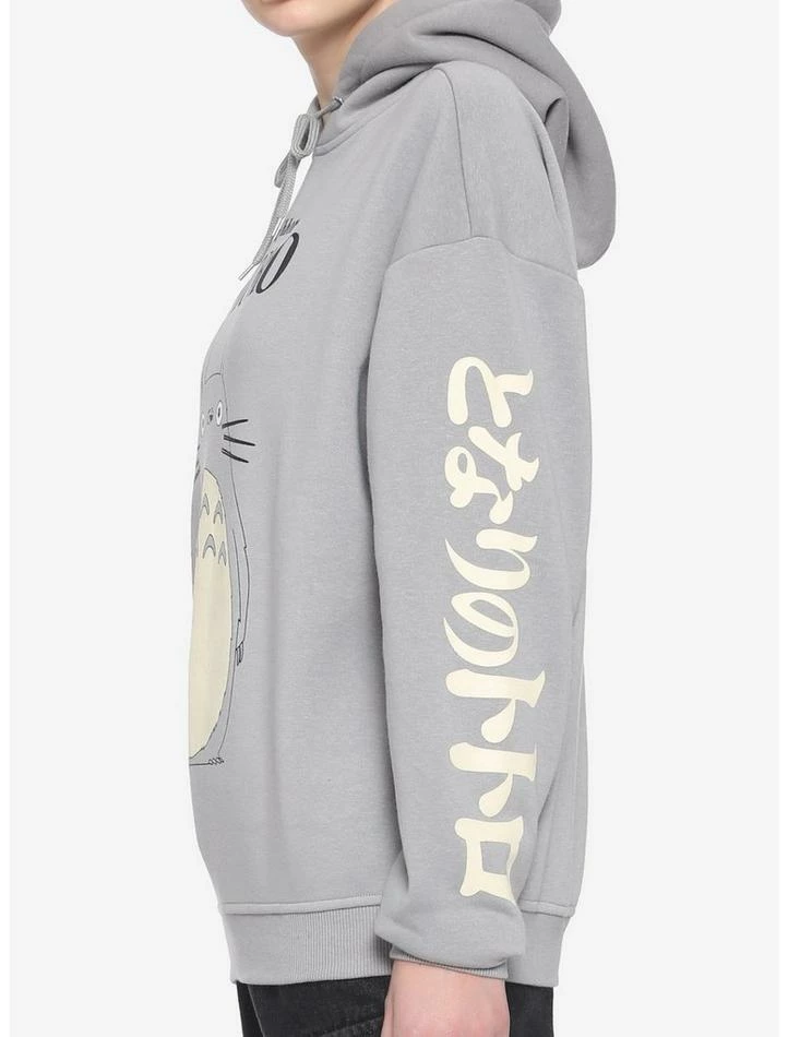 Totoro will make sure you stay nice and warm this winter! This grey My Neighbor Totoro hoodie features a graphic of Totoro in the center and the movie’s logo above him. There is also a Japanese text design on the left sleeve. Drawstring hood.