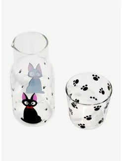Whether you spent all day flying through the skies or you’re preparing to start your shift at the bakery, pour yourself a glass of your favorite beverage with this glass carafe set! Perfect for any young witch, this set comes with a glass carafe and glass mug, featuring Jiji and his paws all over.
