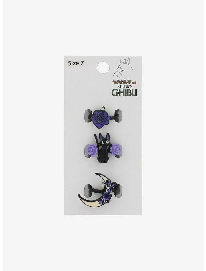 Bring some witchy vibes to your outfit before heading out on your broomstick deliveries with this set of rings! Jiji’s here to add a mystical touch to your look with these rings from Kiki’s Delivery Service, featuring black & purple charms of roses and crescent moons, plus a ring with Jiji at the center, surrounded by purple flowers.
