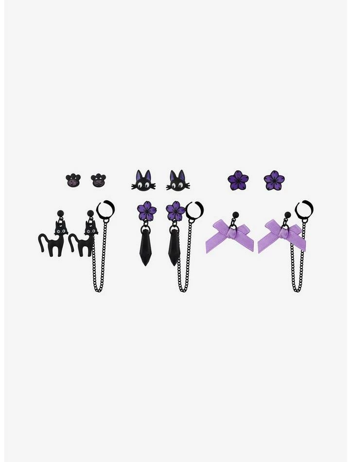 Make all of your broomstick deliveries in style with this pack of cuff earrings! Jiji’s here to add some witchy vibes to your look with this set of Kiki’s Delivery ServiceΒ earrings, featuring studs of Jiji, purple flowers and paw prints, plus drop earrings of Jiji, faux crystals and ribbons. Comes with matching black cuffs for a witch-approved look.