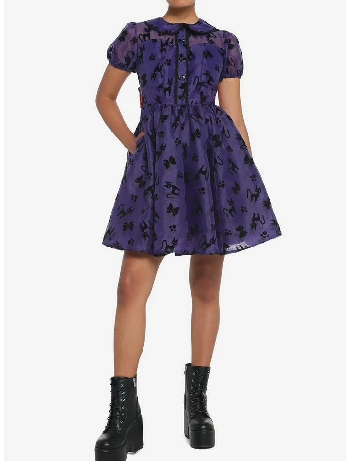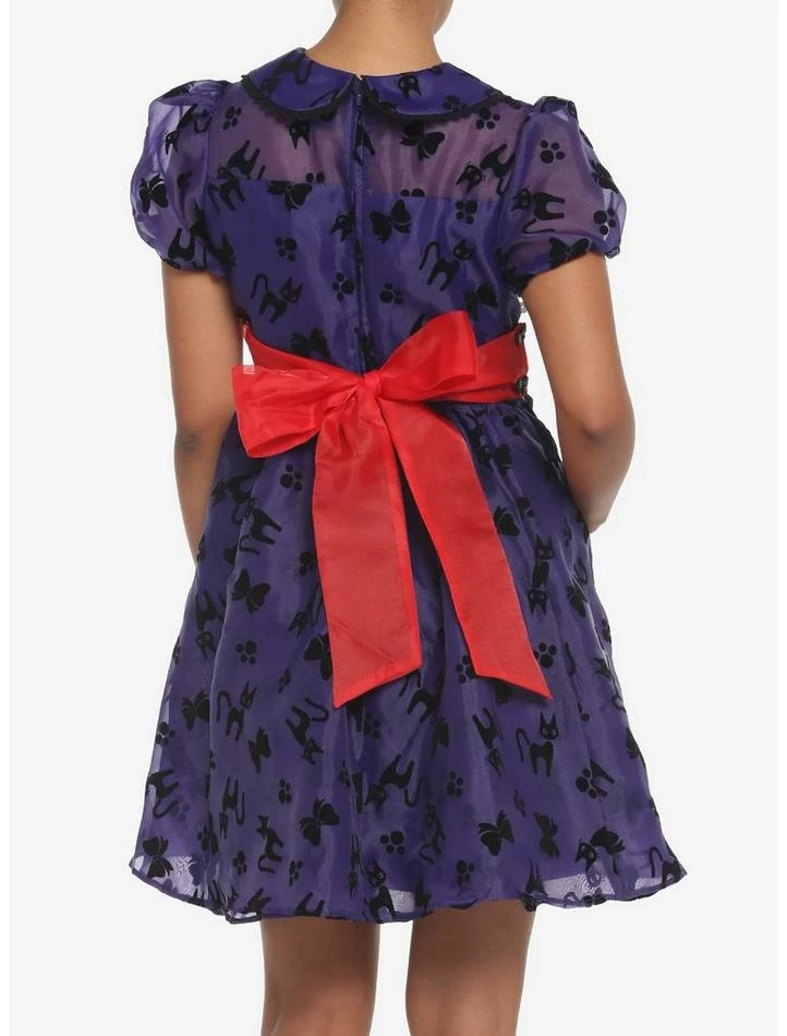 For our next broomstick delivery, we’re serving nothin’ but looks! Take to the skies with this puffy dress on, and with your favorite black cat, of course! This Kiki’s Delivery Serviceย dress features velvet prints of Jiji, bows and paw prints tossed all over, plus black bow buttons down the center chest and at the back to hold the oversized, removable satin ribbon. Complete with elasticated puffy sleeves, a collar and button placket with black lace trim, a sweetheart neckline, pockets and back zipper closure.
