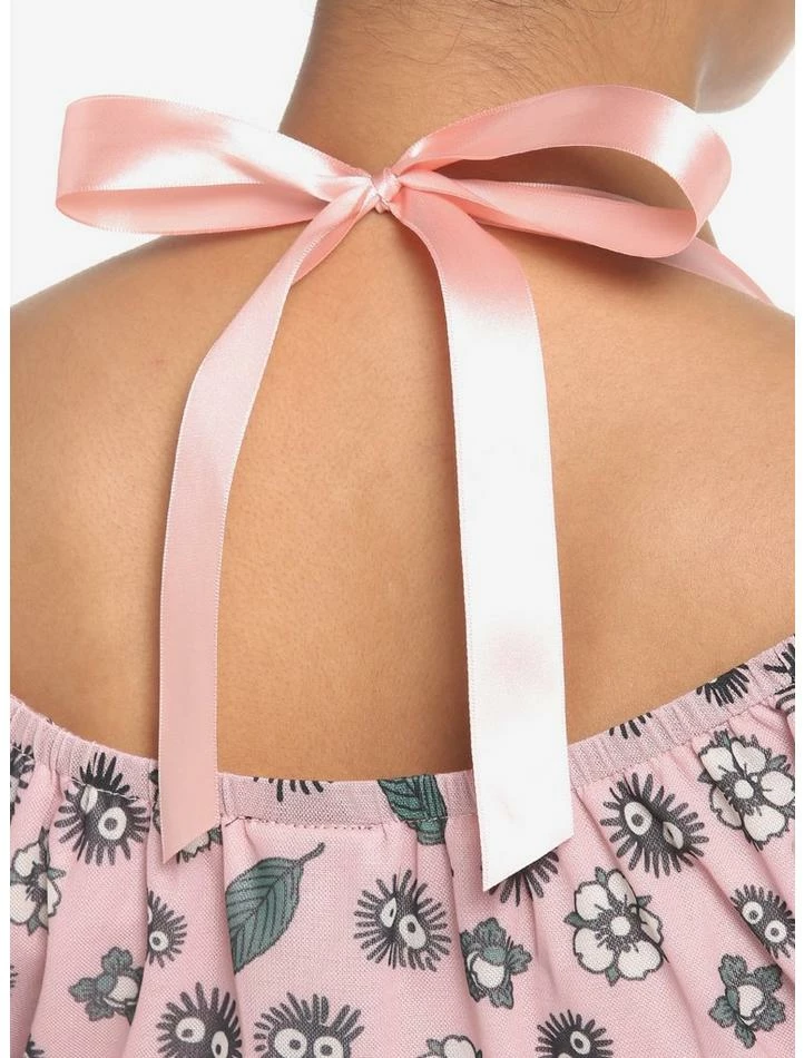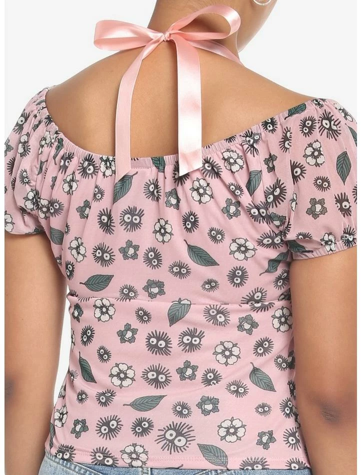 Keep your outfit light and breezy while you’re in the forest with this mesh top! The Soot Sprites are ready to join in on your adventures, and they’re featured all over this My Neighbor Totoroย ruched top. Comes with ruching across the bust and sleeves, with a dusty rose satin ribbon halter tie. Complete with puffy elasticated sleeves and a mesh outer layer.