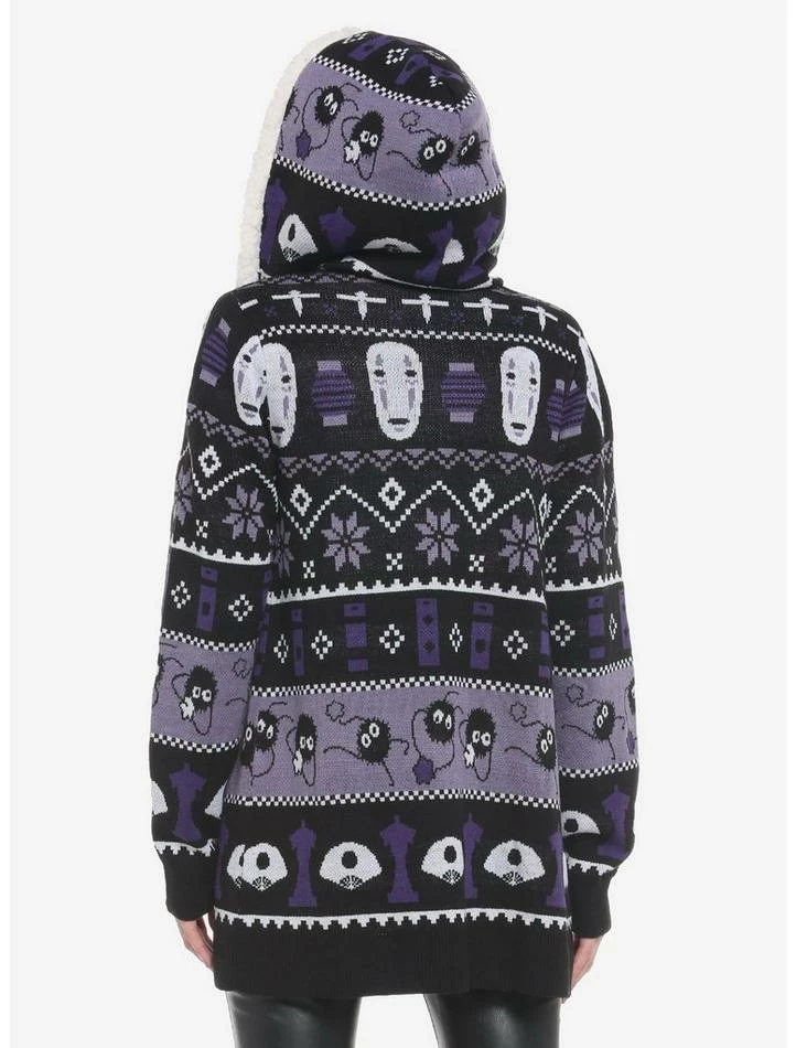 Keep warm after your trip to the Bathhouse! Your faves from the Spirit Realm are here to join you on your next adventure with this Spirited AwayΒ open cardigan, featuring fuzzy lining along the front hems and hood, and a monochrome Fair Isle-inspired design of No-Face, Soot Sprites and more icons from the film.