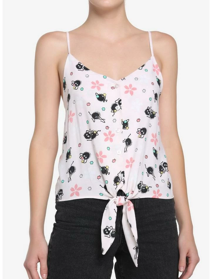 Β It can get pretty warm working the boiler room at the Bathhouse. Keep cool in this pink, Spirited Away tank! It features a toss print of Soot Sprites and their star candy, along with sakura flowers. Comes with button-up and tie-front detailing, a V-neckline and adjustable spaghetti straps.