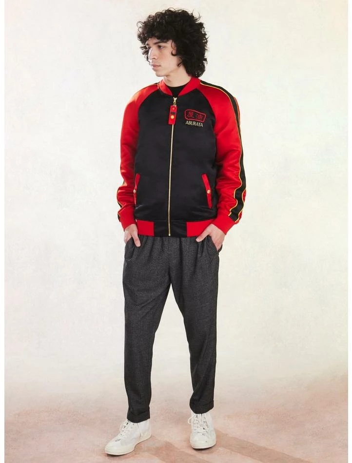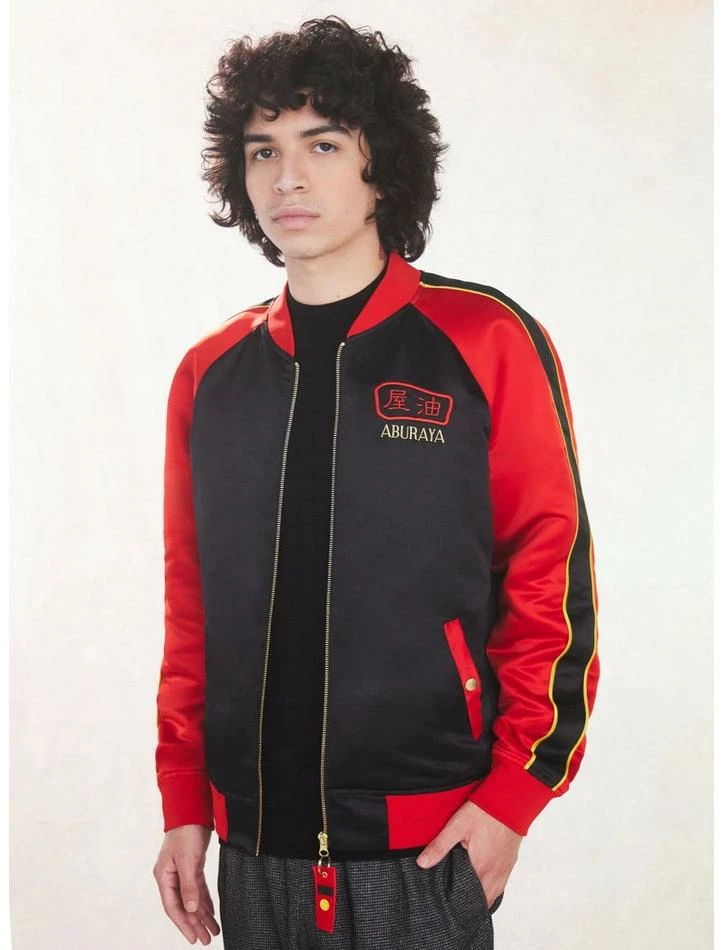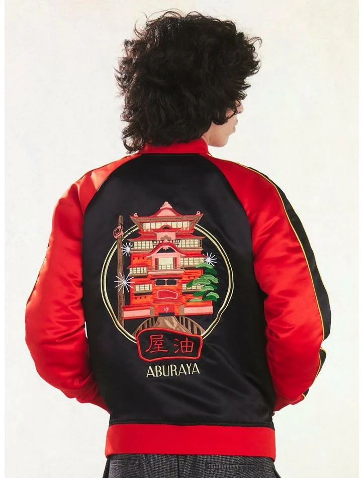 Look fresh while feeling refreshed after a trip to The Bathhouse in thisΒ Spirited AwayΒ bomber jacket! Featuring red and black color blocking and a gorgeous embroidery of The Bathhouse on the back with “Aburaya” below. Plus, “Aburaya” embroidered at the chest, along with Japanese text. Complete with snap-button front pockets and a front zipper closure.