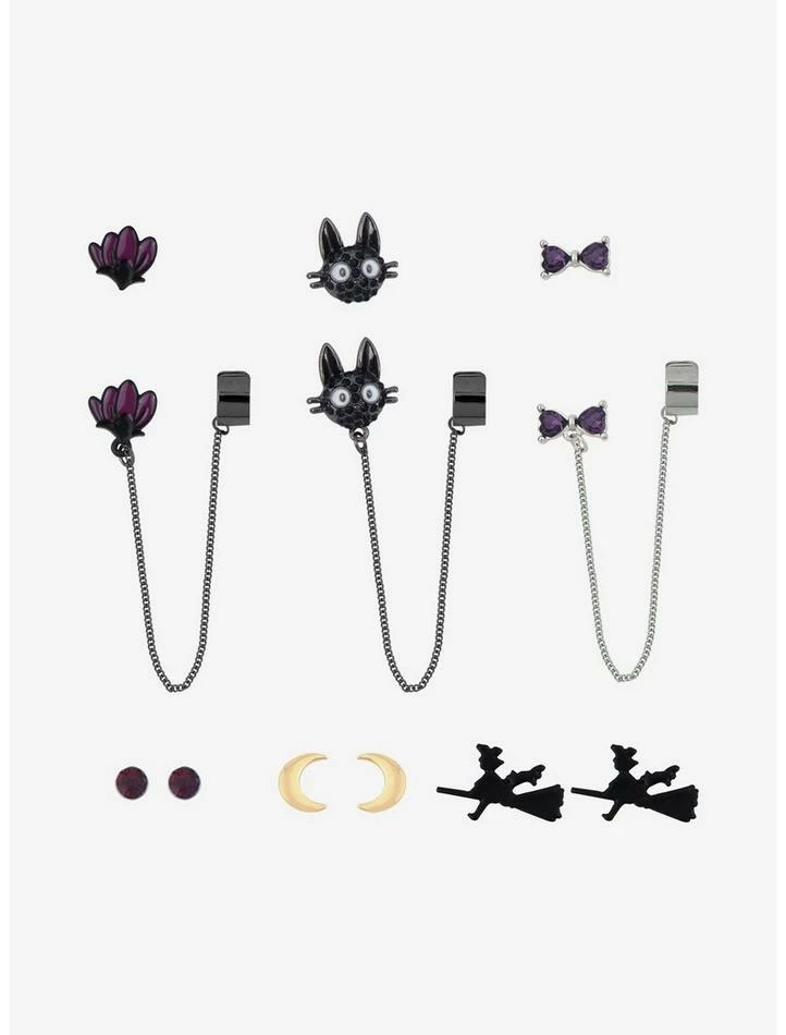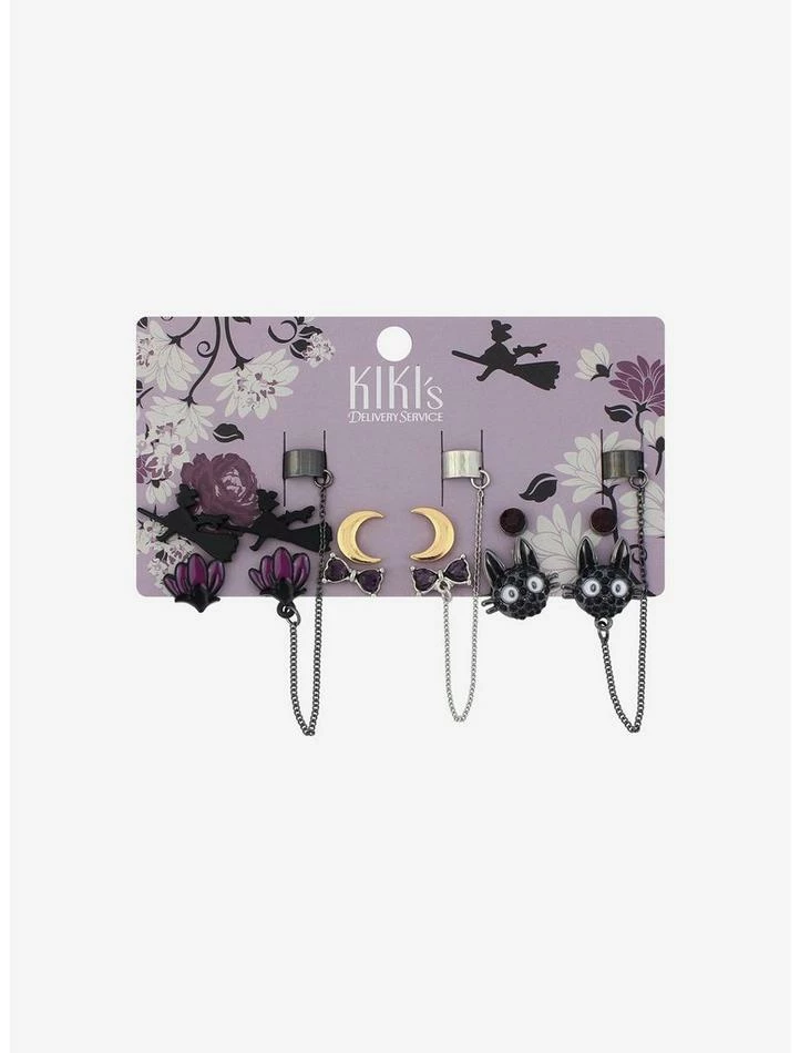 Add some magic to your ears with this set. From Kiki’s Delivery Service, there are studs of moons, Kiki and Jiji silhouette and purple CZ. There are also purple flowers with attached cuff, CZ Jiji with attached cuff and CZ purple bow with attached cuff.