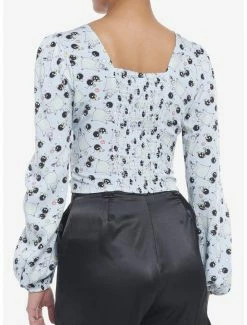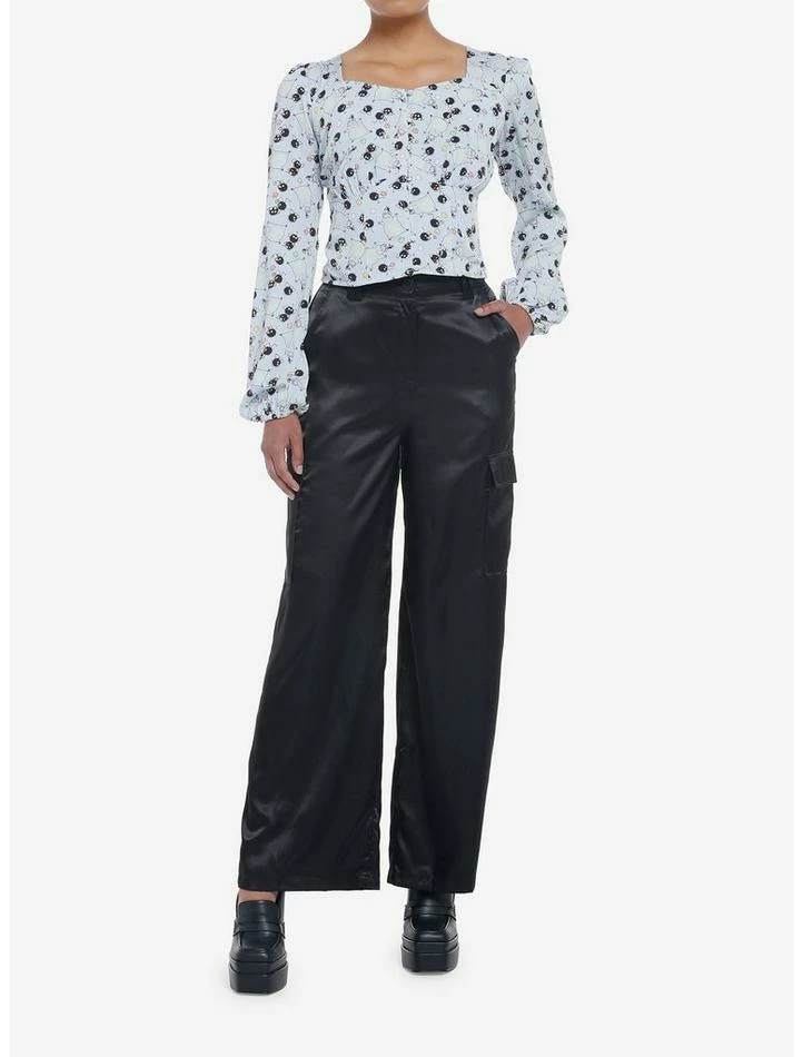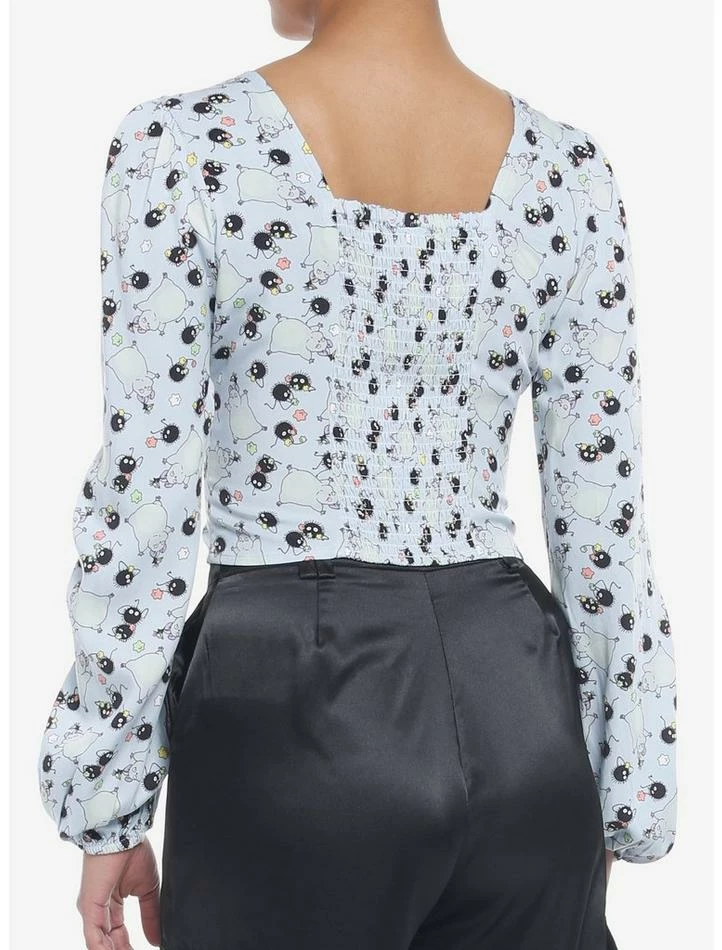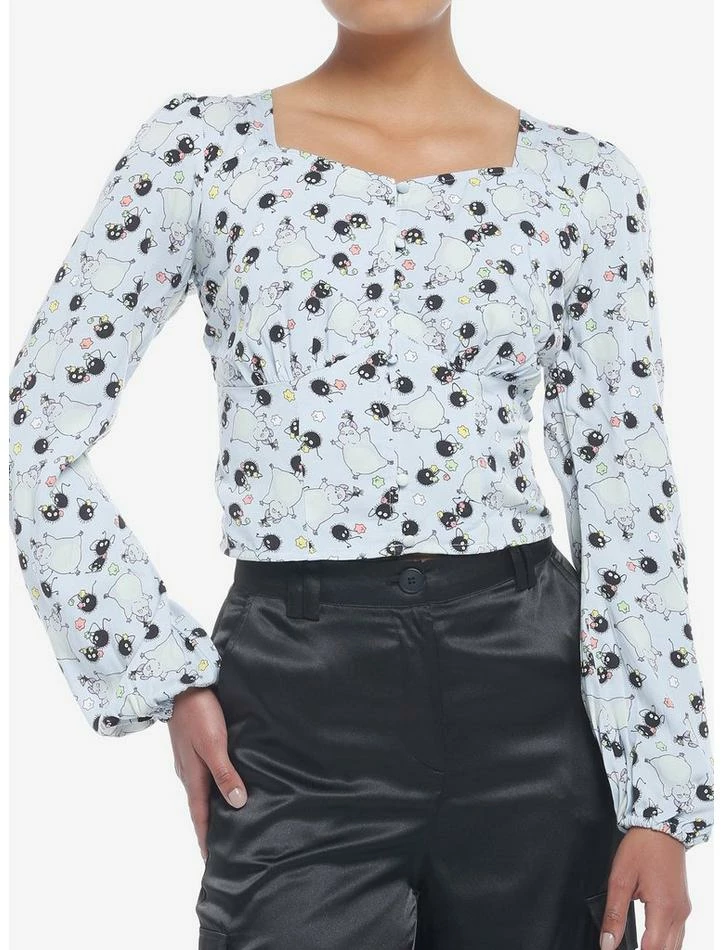 The Soot Sprites from Spirited Away are always a fun and festive look. This woven button-up has a cropped fit with fitted seaming at the bust and fabric-covered buttons for a refined vibe.